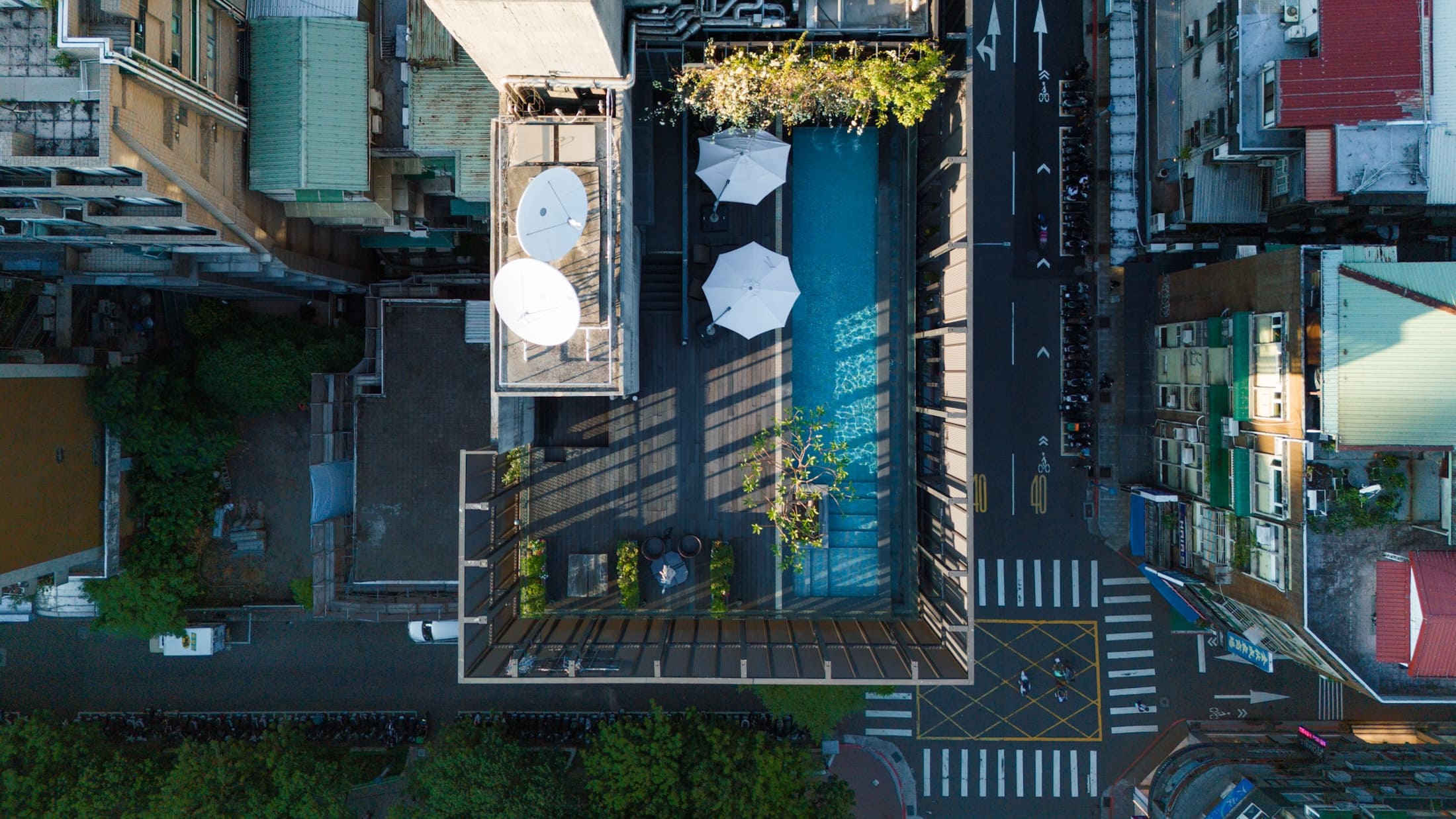 頂樓的景觀水池區宛如一個秘密花園,映照藍天與光影,綠意環繞,讓人暫離喧囂。
